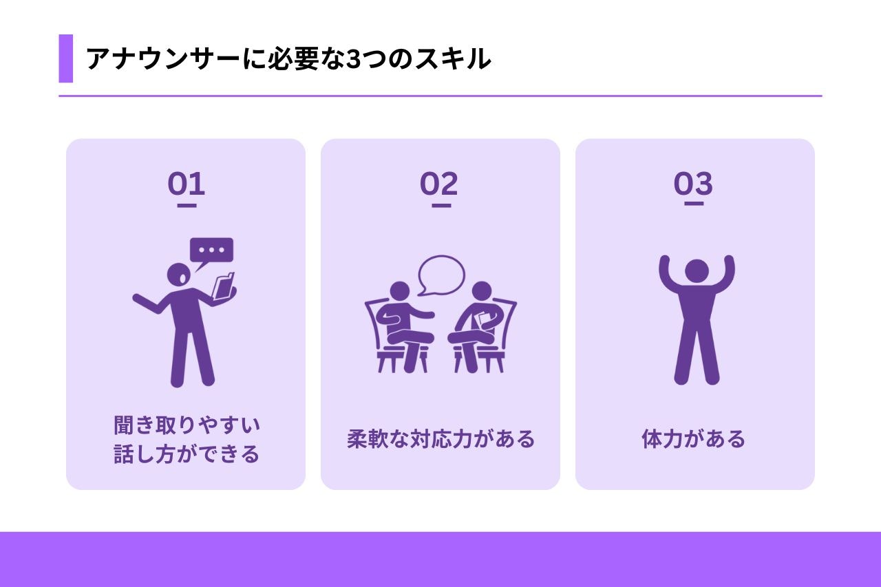 アナウンサーには、さまざまなスキルや特性が求められます。ここで紹介する3つは、特に重要なスキルです。