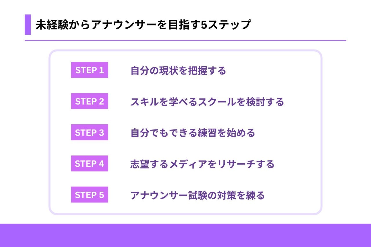 アナウンサーは憧れの職業ですが、未経験から目指すためには計画的な準備と努力が必要です。以下の5つのステップで道筋を立ててみましょう。