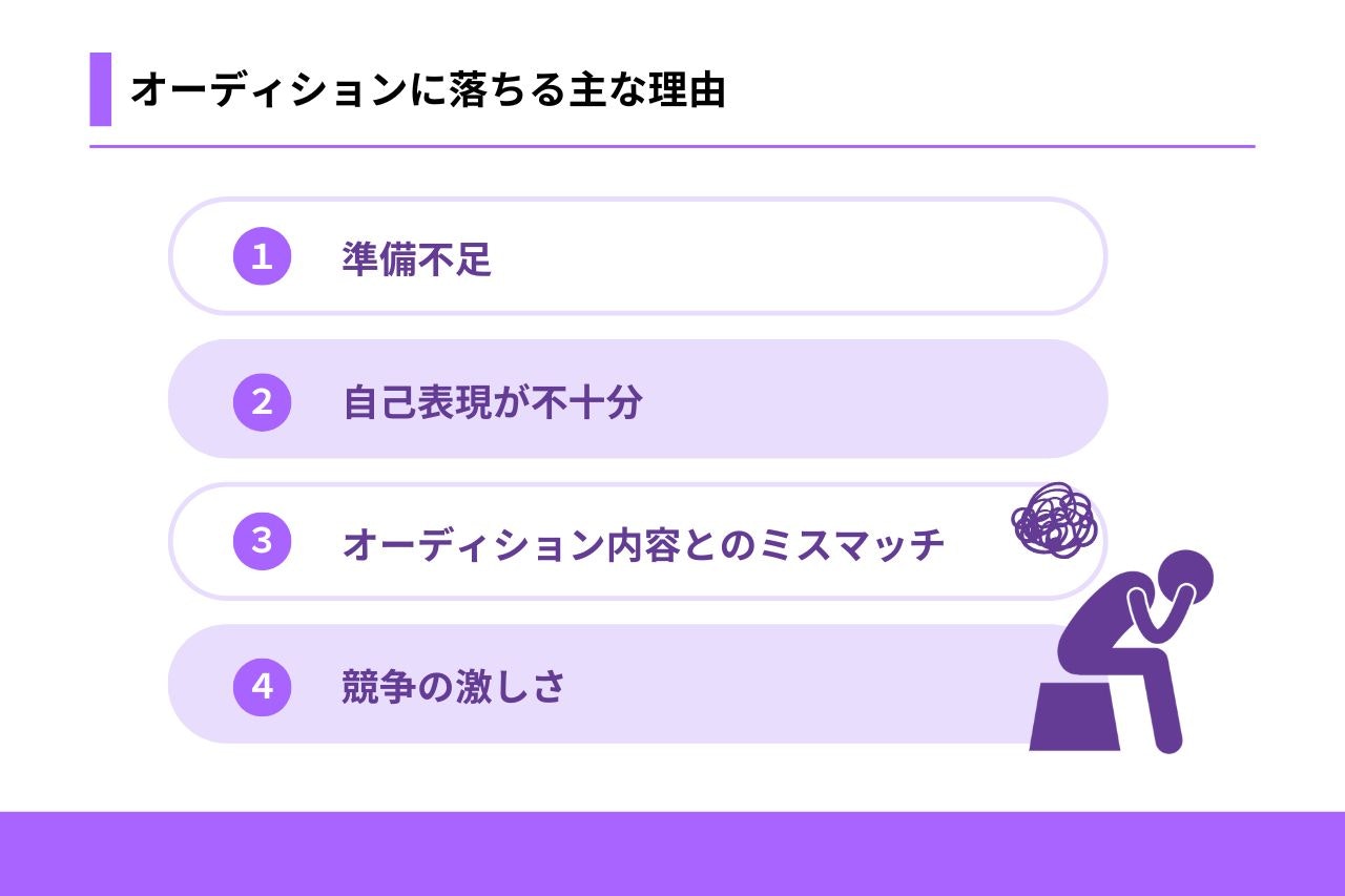 オーディションに落ちる理由はさまざまですが、よくある原因を知っておくことは、次の挑戦に役立ちます。ここでは、オーディションに落ちる主な理由を4つご紹介します。