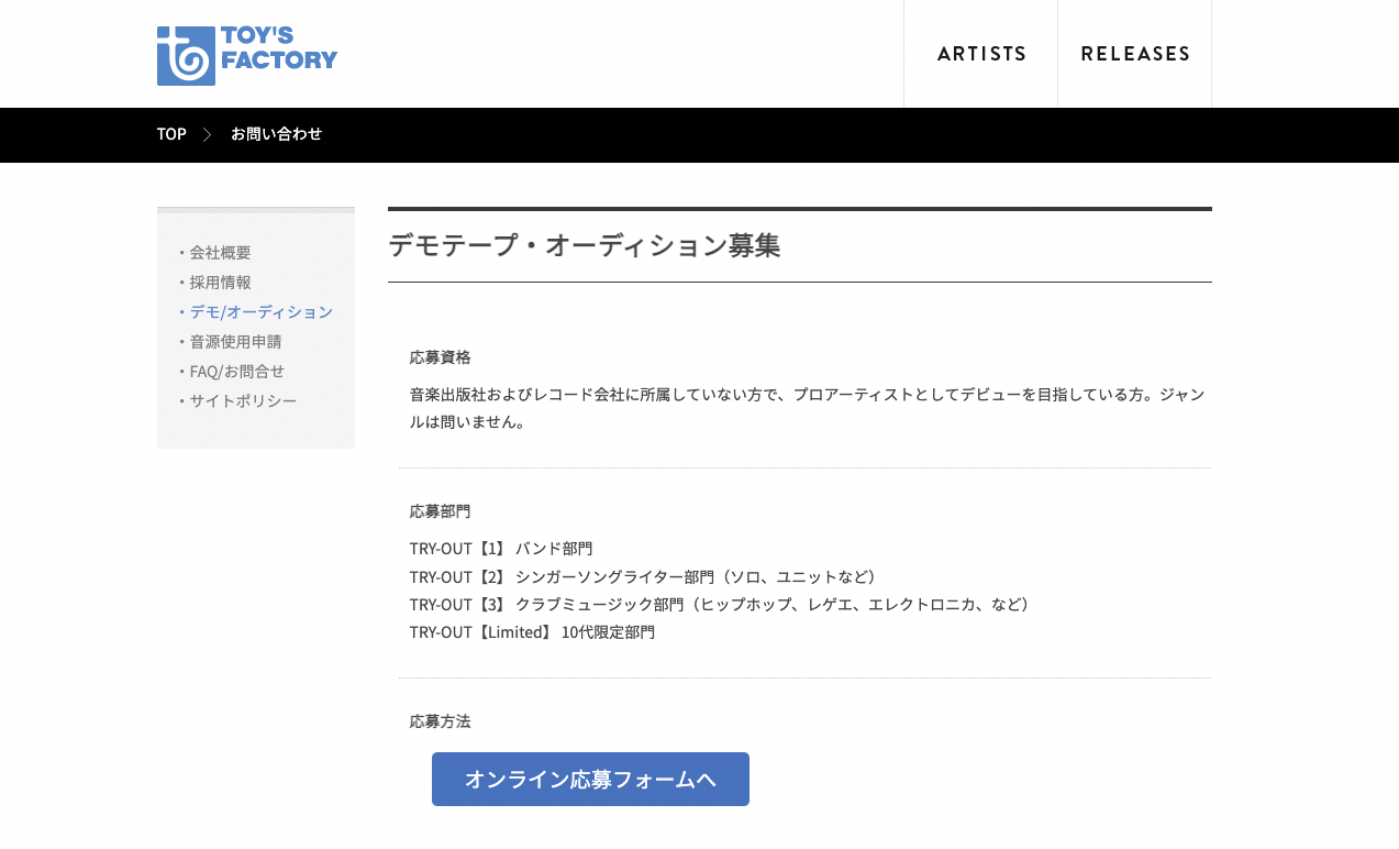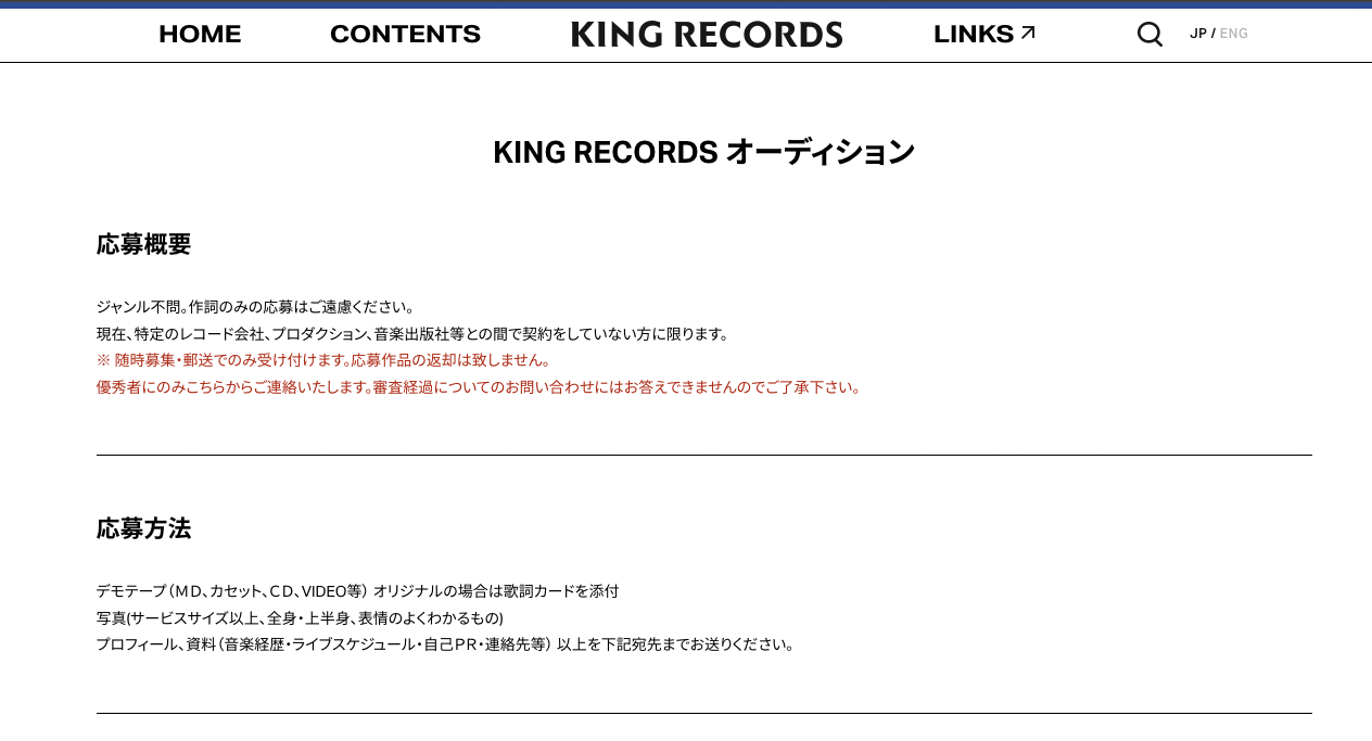 ・大手 ・未経験可 ・年齢制限なし | ・ジャンル不問(作詞のみの応募は不可) ・現在、特定のレコード会社、プロダクション、音楽出版社等との間で契約をしていない方に限る | |