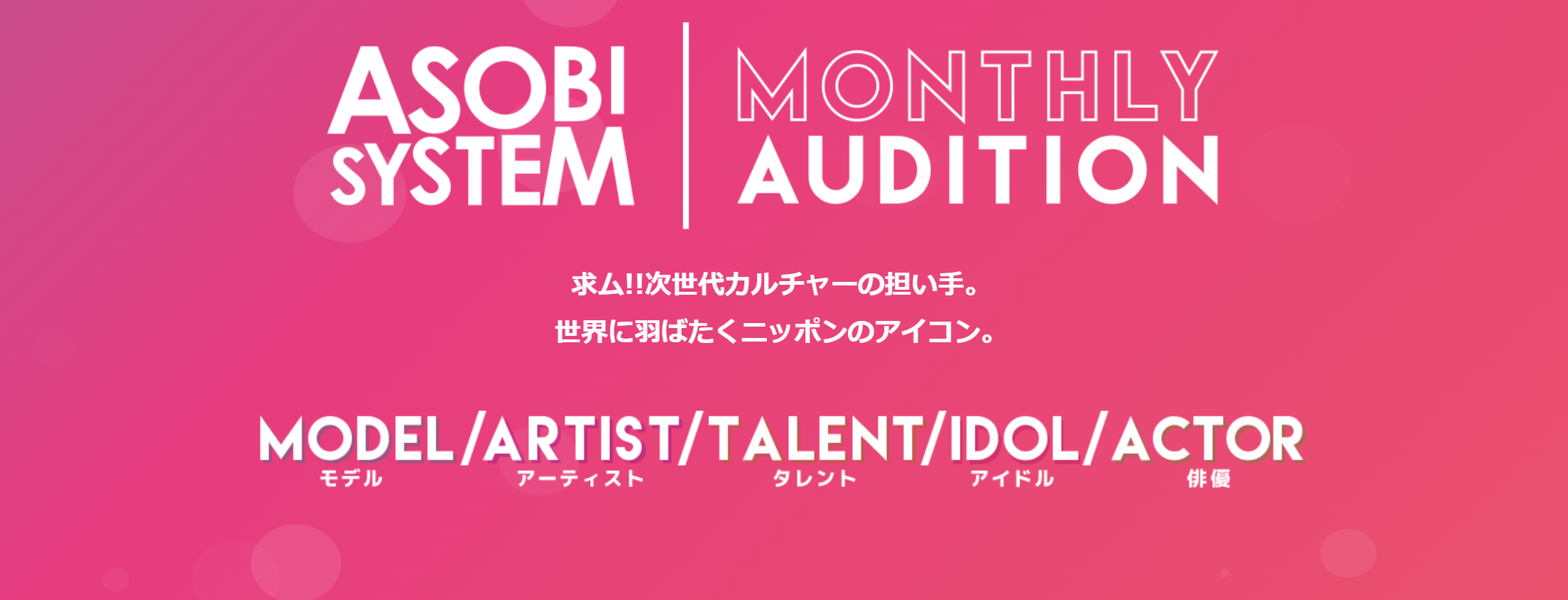 ・未経験可 ・オーディション参加費無料 | ・10歳~29歳の男女 ・東京会場・大阪会場に参加可能な方 ・国籍・経験不問 ・日本語がしっかりと話せる方 ・特定のプロダクションに所属していない方 ・応募は個人のみに限る(バンドなど、グループでの応募は不可) ・芸能経験がなくてもOK ・未成年の方は親権者の同意が必要 | |