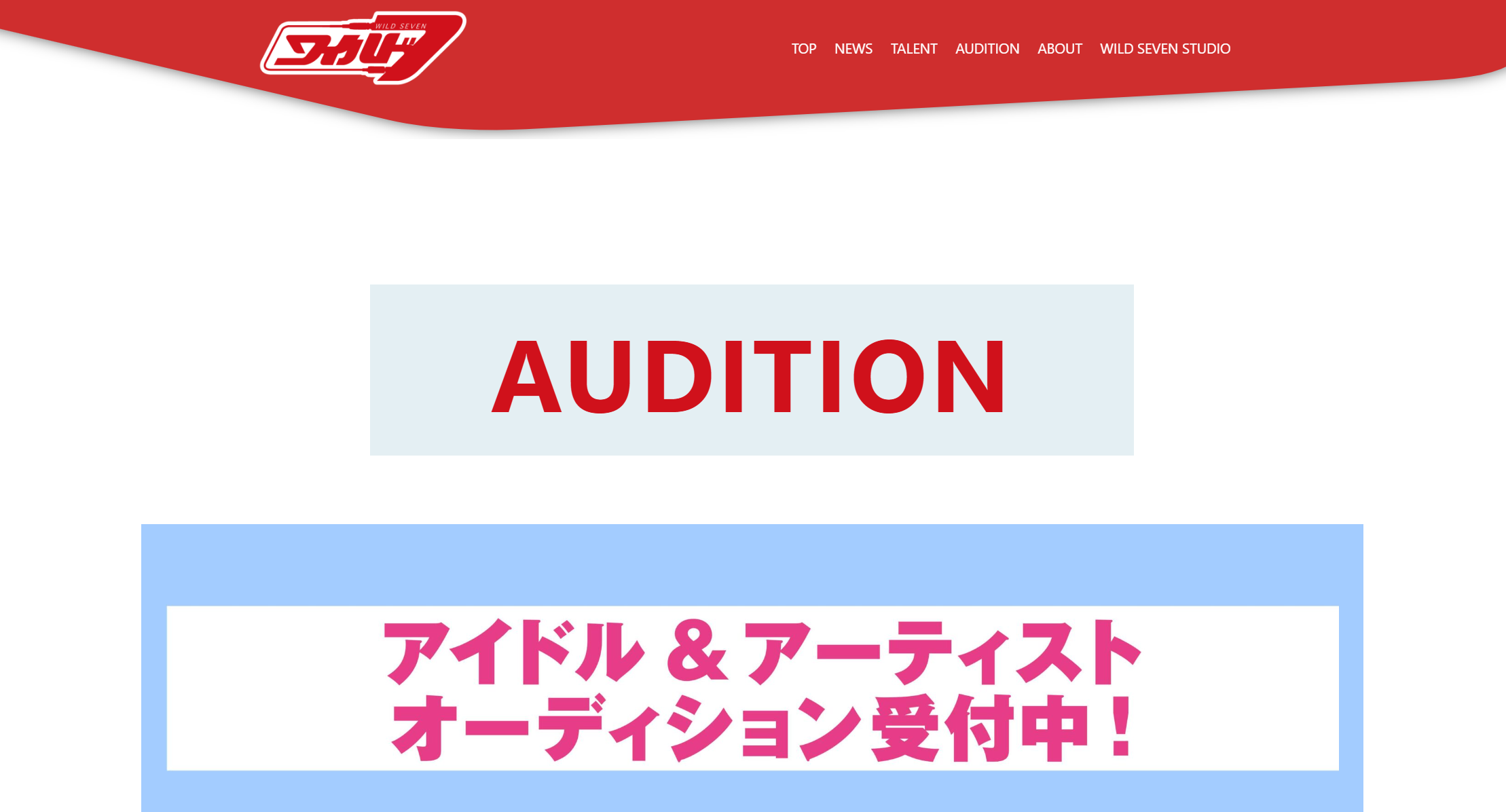 ・未経験可 ・オーディション参加費無料 | ・6~35歳までの男女なら誰でも ・特定のプロダクションと契約されていない方に限る | |