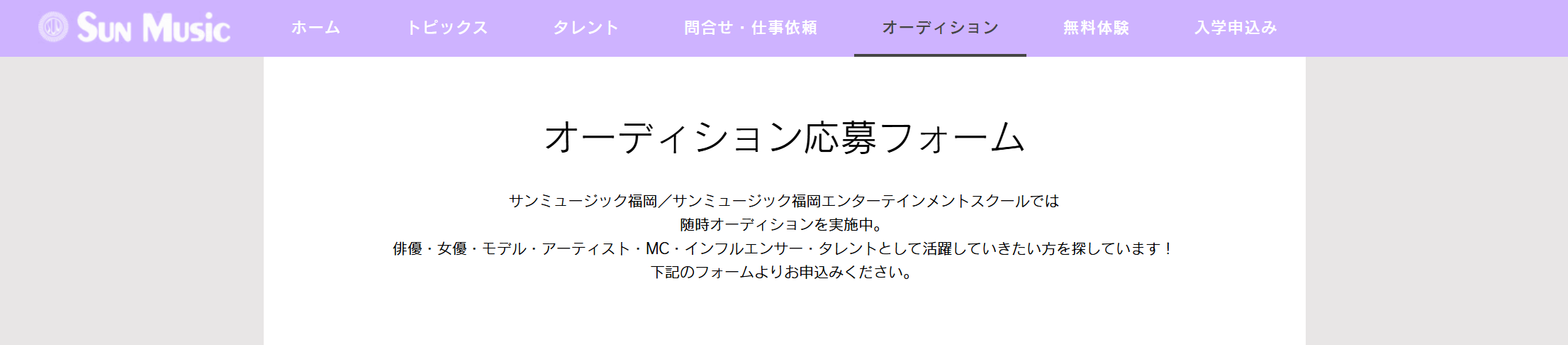 ・未経験可 ・オーディション参加費無料 | シンガーソングライター、バンド、歌手、プレイヤー(楽器)、作家、舞台・ミュージカル、俳優ジャンルなどで活躍したい才能あふれる方 | |