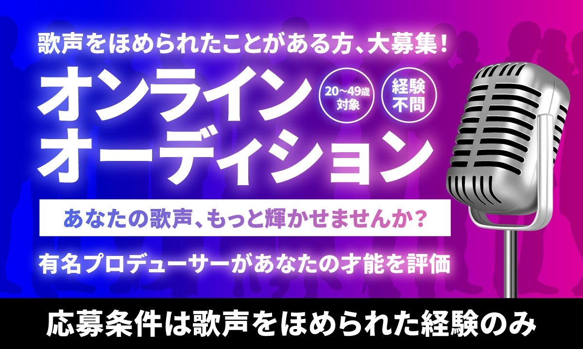 対面・遠隔(オンライン)の2種類で実施。顔出し不要、スマホでの録音OK。有名プロデューサーが直接審査。オンラインで気軽に参加でき、プロの評価が得られる貴重な機会。前向きな挑戦を応援する雰囲気が魅力。 | |