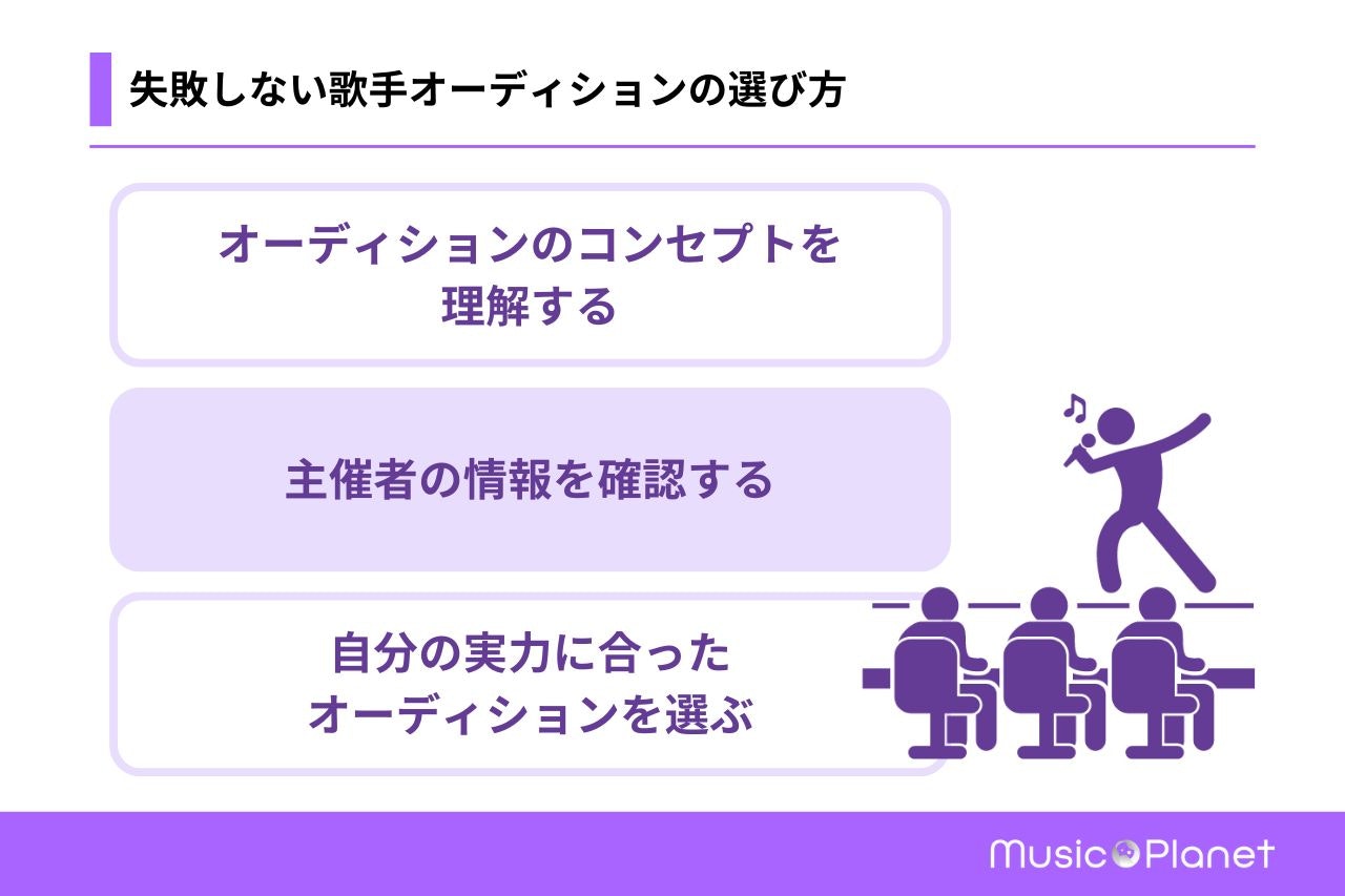 失敗しない歌手オーディションの選び方で大切なポイントは、以下の3つです。