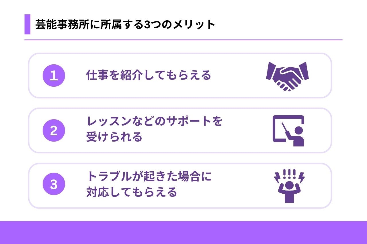 芸能事務所に所属するメリットは、大きく以下の3つが挙げられます。