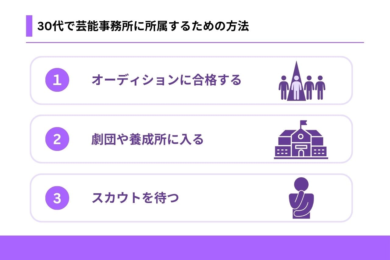 そこで本記事では、30代で芸能事務所に所属するための3つの方法や、実際に応募できる芸能事務所オーディションなどを紹介します。ぜひ参考にしてください。