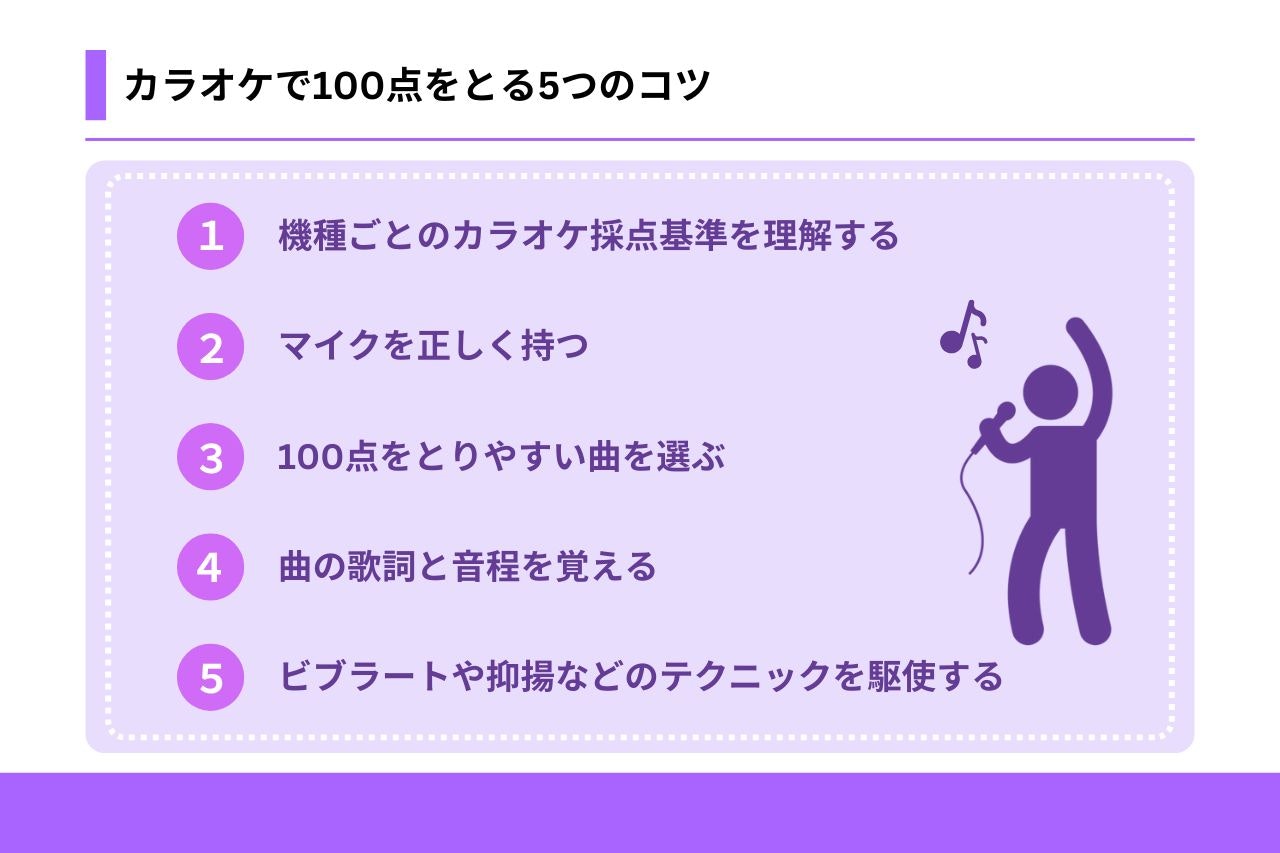 カラオケで100点をとるコツは大きく以下の5つです。