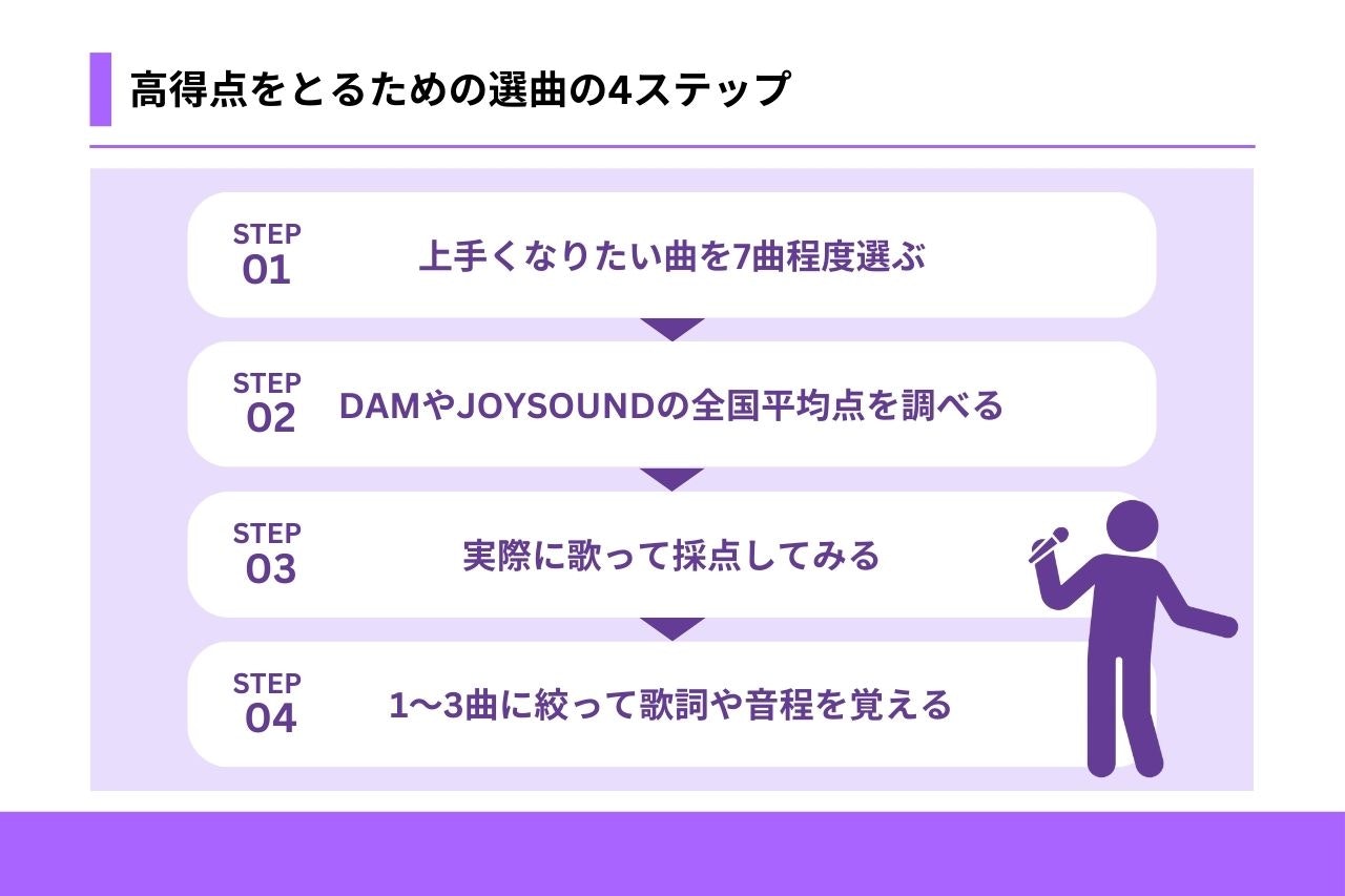 高得点をとるためには、以下の4つのステップを踏んで選曲するとよいでしょう。