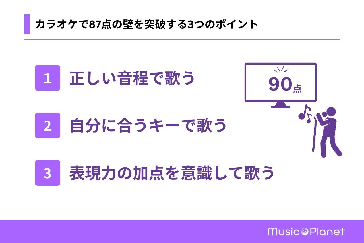 ここからは、カラオケで87点の壁を突破するためのポイントを紹介します。具体的には、次の3つです。