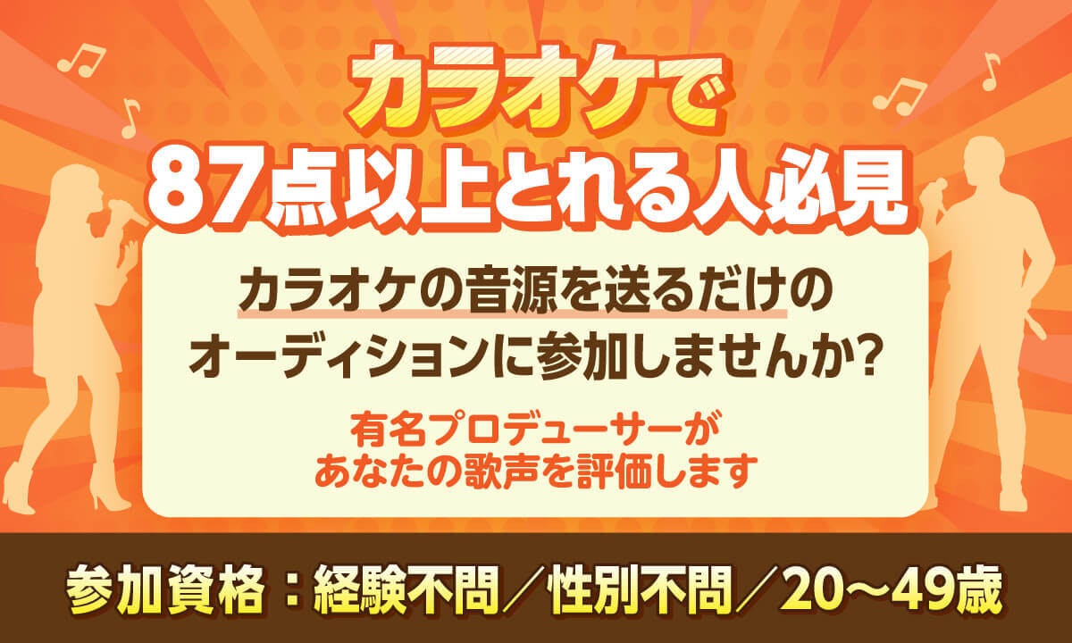 そして、カラオケで87点以上とれる方は、ぜひMusic Planet(ミュージックプラネット)のボーカリストオーディションに挑戦してみてください。審査後にプロデューサーから個別のコメントをもらえるため、歌の上達や自分の歌声の強みを把握するうえでも役立ちます。