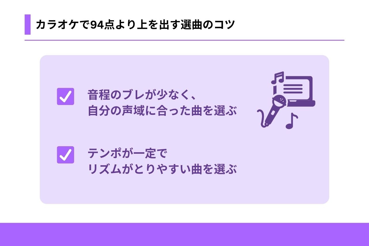 カラオケで94点以上を出すには、曲選びが重要です。音程のブレが少なく、自分の声域に合った曲を選ぶことで、安定した発声がしやすくなります。