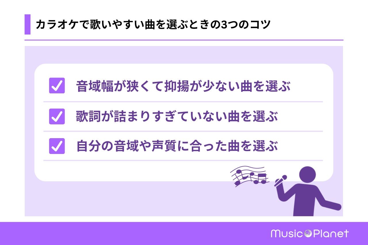 カラオケに行って「歌、上手いね!」とほめられたら、誰だって嬉しいですよね。そこで、ここからはカラオケで歌いやすい曲を選ぶときのコツを紹介します。具体的には、次の3つです。