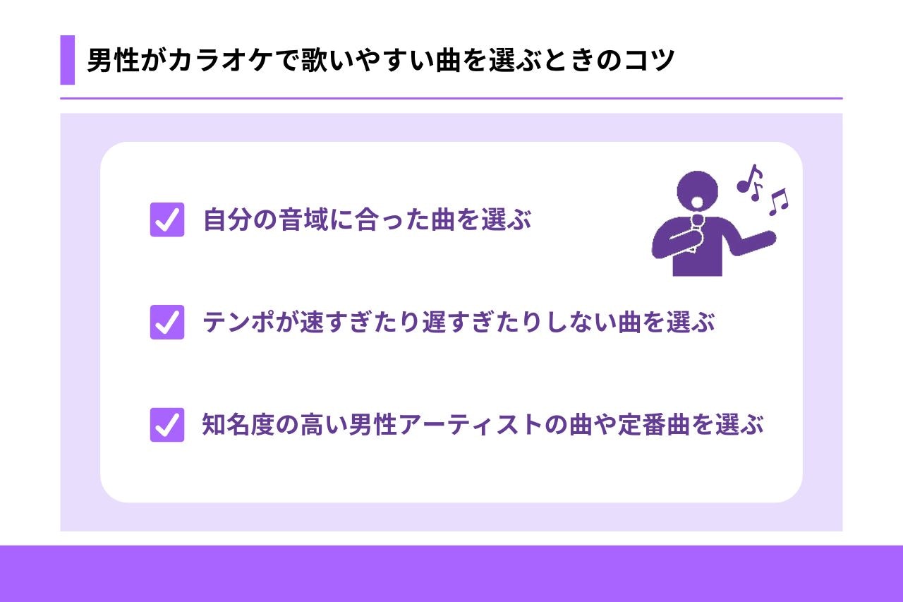そこで、ここからは男性がカラオケで歌いやすい曲を選ぶときのコツを紹介します。具体的には次の3つです。