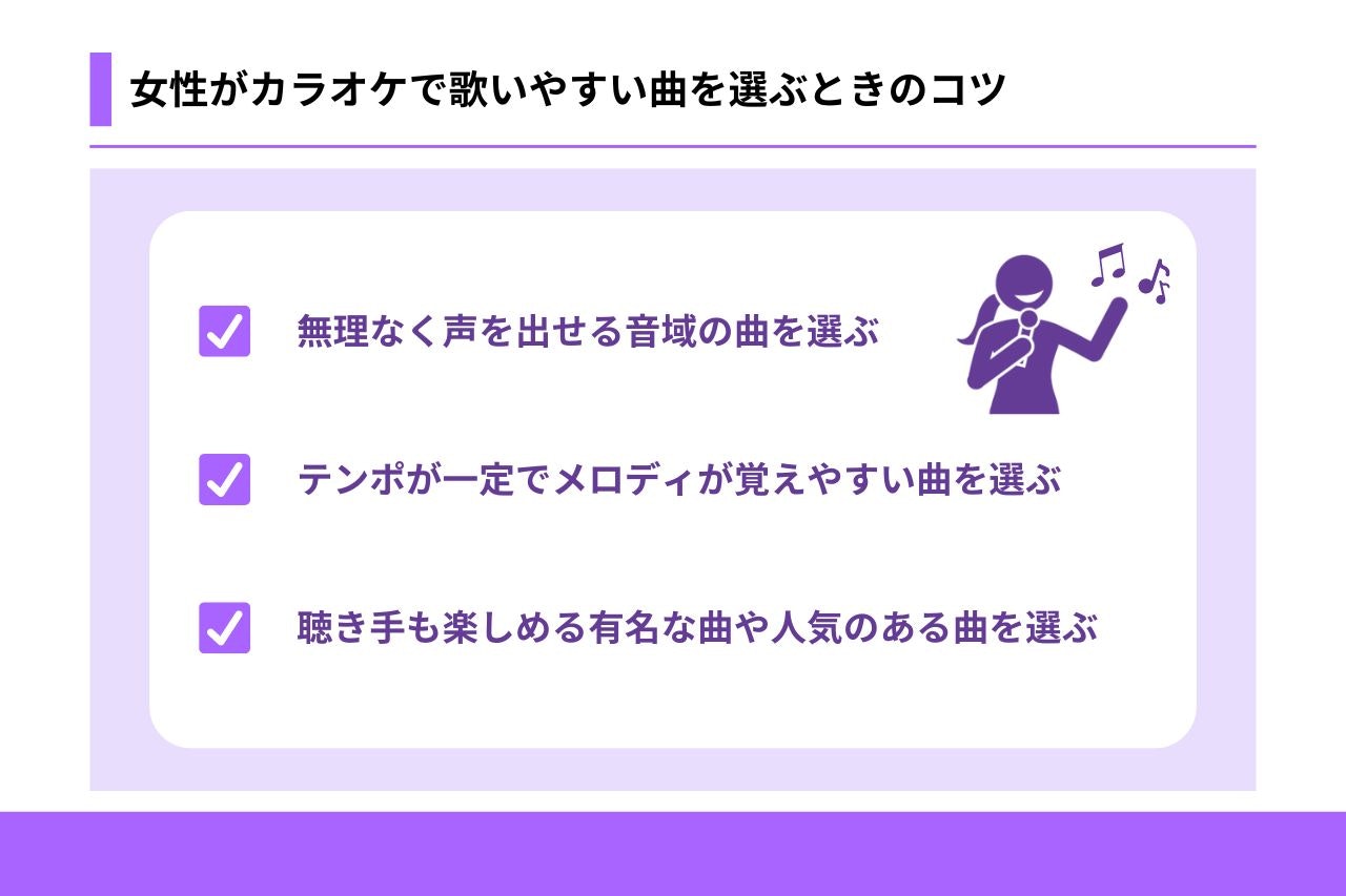 ここまで女性がカラオケで歌いやすい曲を紹介してきましたが、ほかにも歌ってみたい曲があるかもしれません。そこで、カラオケで歌いやすい曲を選ぶときの3つのポイントを説明します。