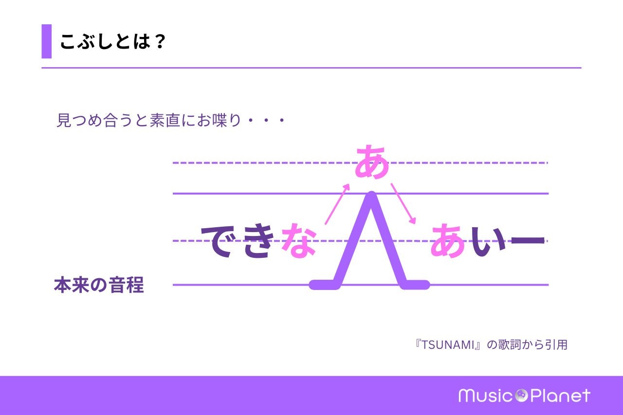 こぶしとは、音程を瞬間的にうねらせるテクニックのことをいいます。J-POPの場合、連続的におこなうよりは、感情をのせた大きなうねりを1つ加えることが多いでしょう。