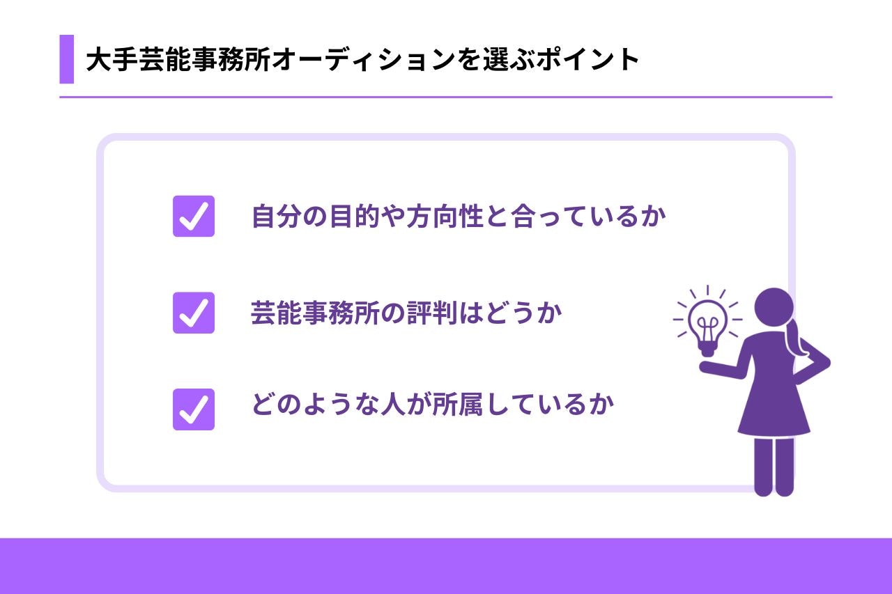 自分に合う芸能事務所オーディションは、次のような3つのポイントを押さえて探しましょう。