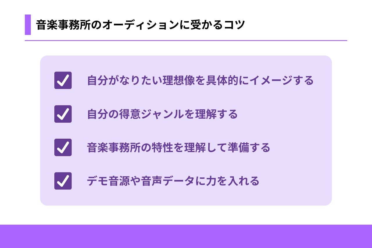 そこで、ここからは音楽事務所のオーディションに受かるコツを4つ紹介します。