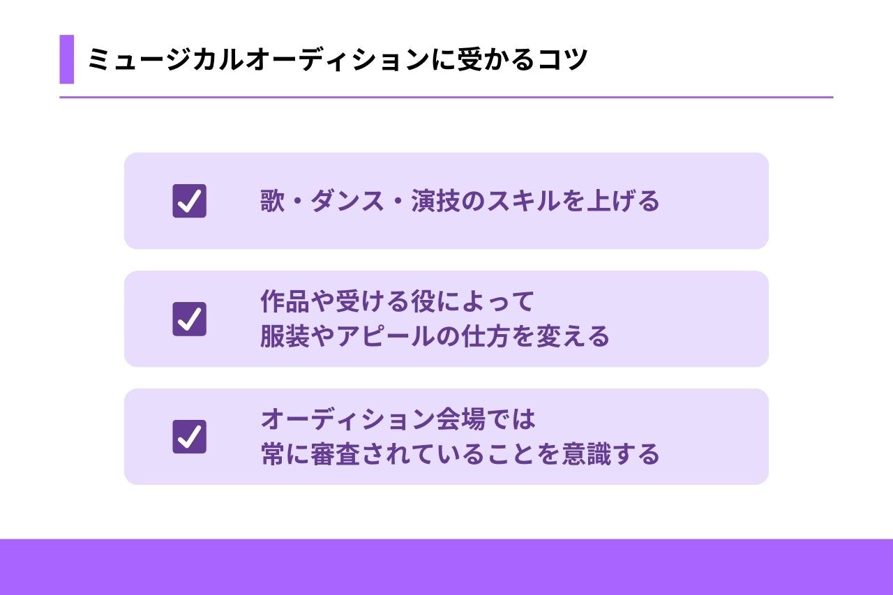 ミュージカルオーディションを受けるなら、少しでも自分をよく見せて合格したいですよね。そこで、ミュージカルオーディションに受かる3つのコツを紹介します。