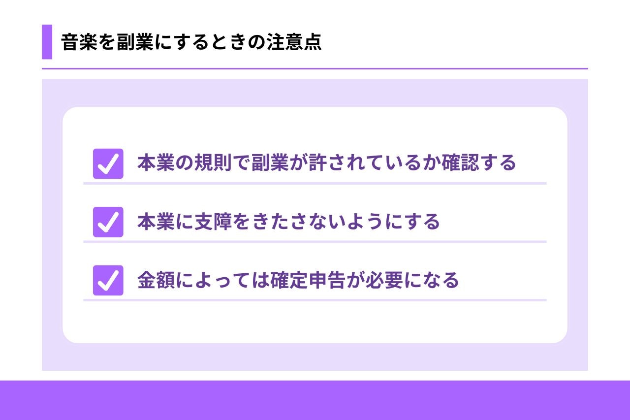 音楽を副業にするなら、好きな仕事だからこそ熱中しすぎないように気をつける必要があります。熱中するあまりに本業に支障が出てしまうと、評価が下がったり、最悪の場合には解雇されたりする可能性もあります。