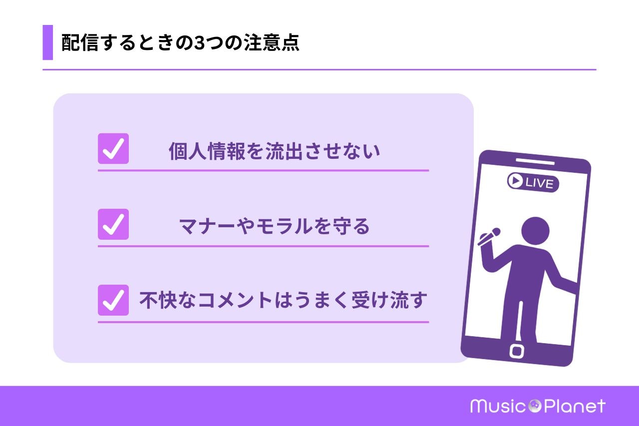 特に配信初心者は、その場の状況に応じた臨機応変な対応が難しかったり、困ったことがあったときに悩んだりしてしまいがち。必ず注意点を頭に入れておきましょう。