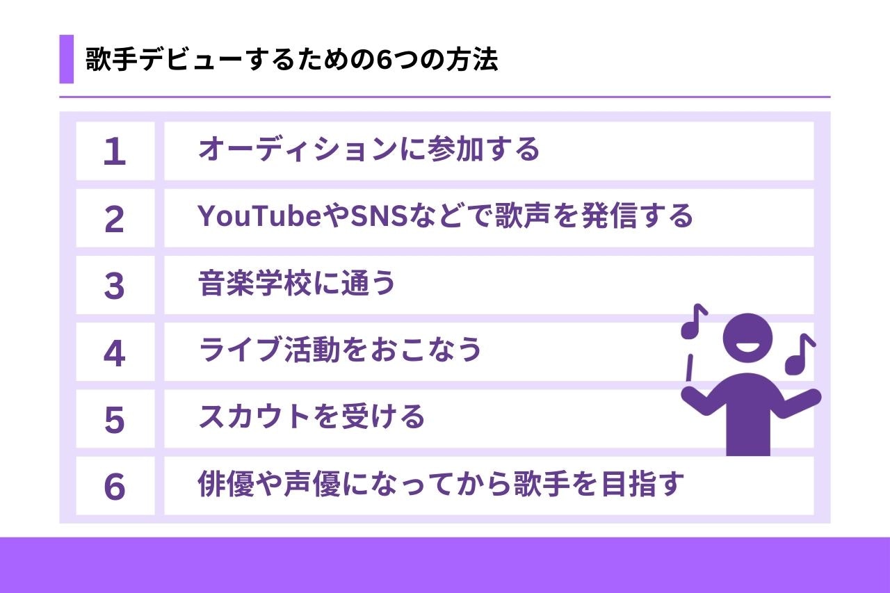 オーディションについては、本記事内の「歌手デビューしたい方必見!おすすめオーディション3選」もあわせてご覧ください。