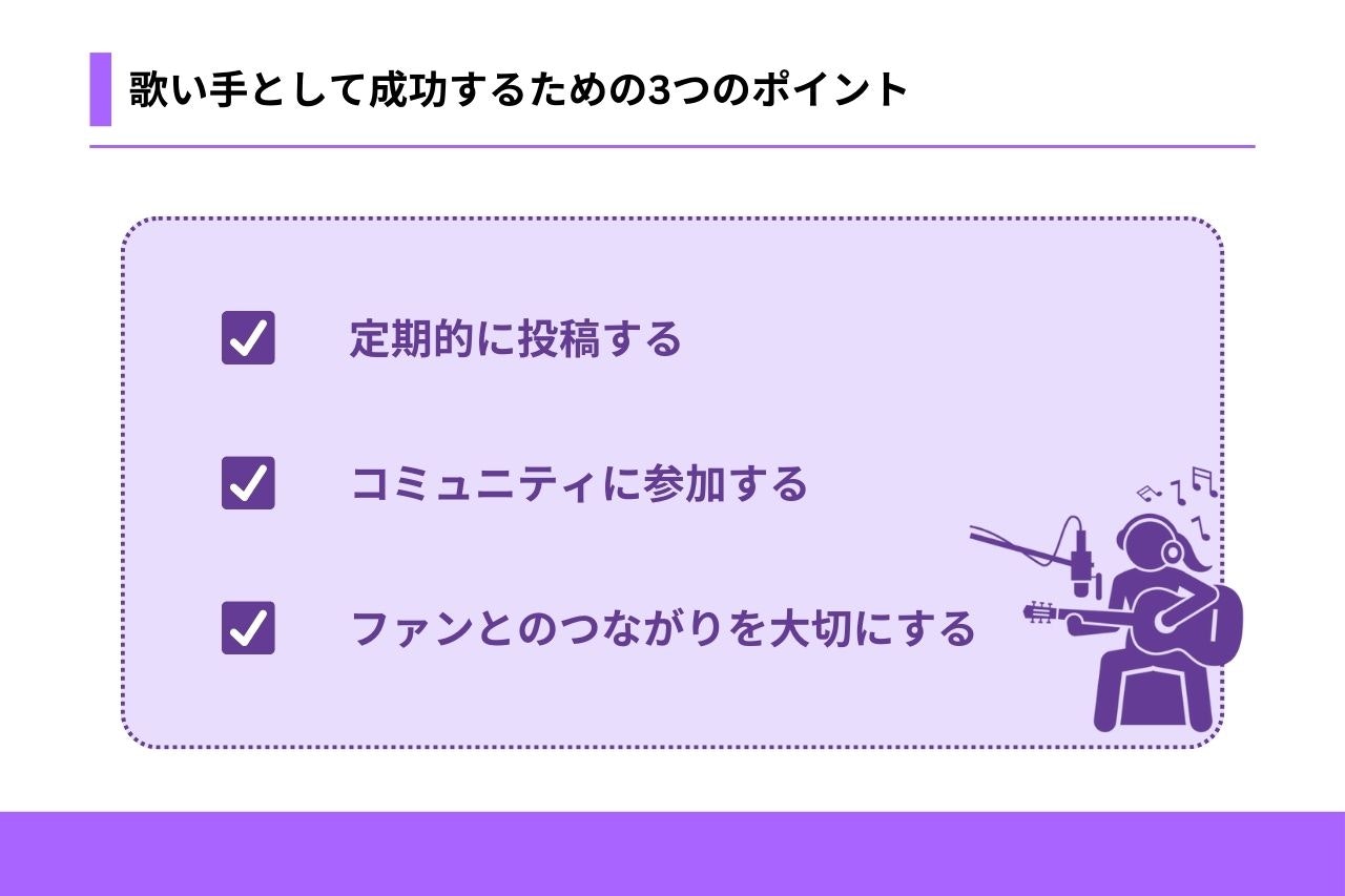 「本気で歌い手になりたい!」「成功したい!」と考えている方は、以下の3つのポイントを押さえておきましょう。