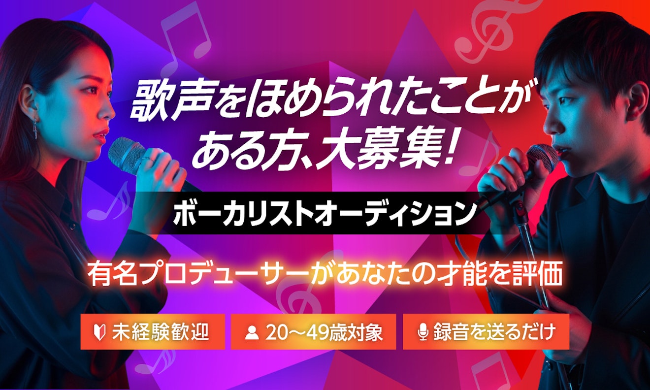 オーディションは学生を除く20~49歳が対象で、合格後は仕事をしながらの活動も可能。「自分なりの歌手活動がしてみたい」という方に、必要なサポートと環境を提供します。ミュージックプラネットのオーディションに挑戦して、自分の歌声の可能性を広げてみませんか?歌い手としての一歩を踏み出したい方は、ぜひお気軽にお問い合わせください。