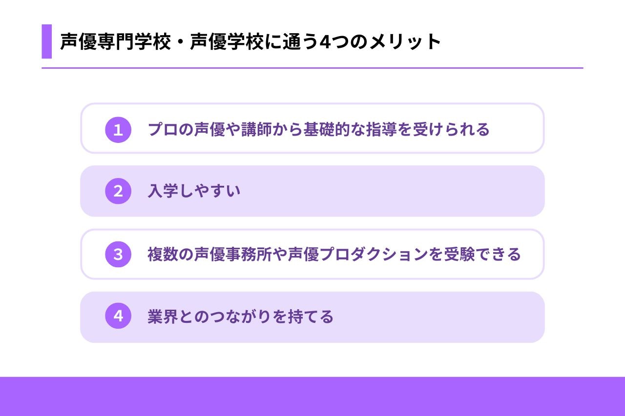 声優専門学校・声優学校に通うメリットは以下の4つです。