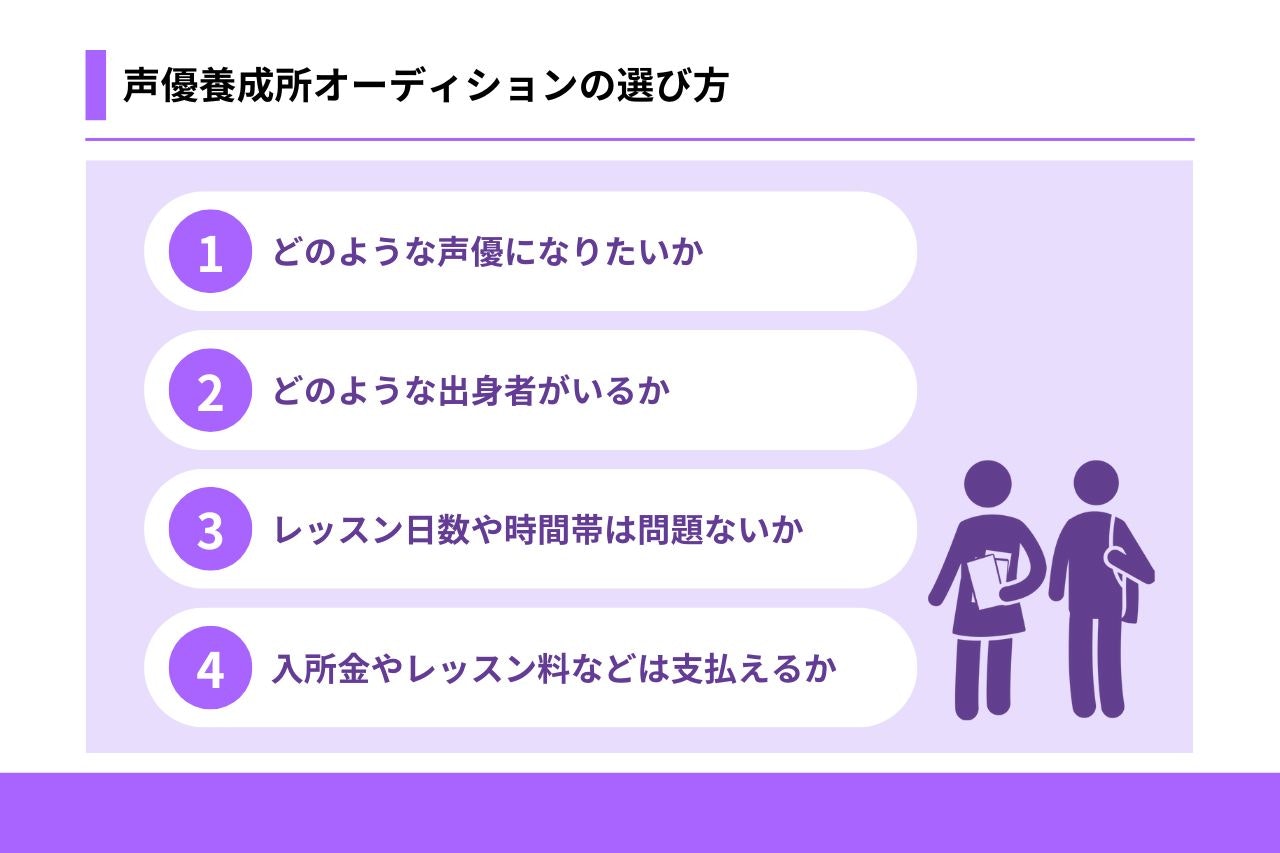 ここからは、声優養成所オーディションの選び方についてポイントを紹介します。