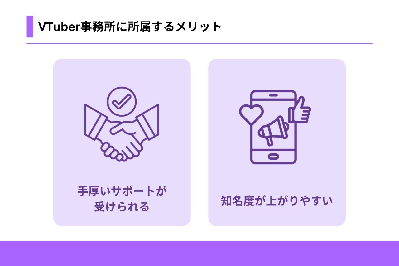 VTuber事務所に所属すると、1人では難しいこともグッとやりやすくなるのが大きなポイントです。ここでは、次の2つのメリットをご紹介します。