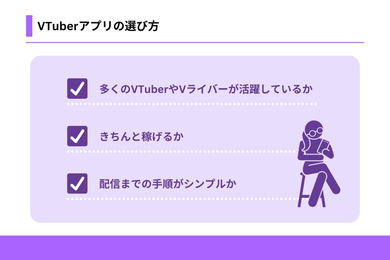 5つのVTuberアプリをご紹介しましたが、「どれを選んだらよいかわからない」と困っている方もいるかもしれません。VTuberアプリの選び方のポイントは以下の3つです。