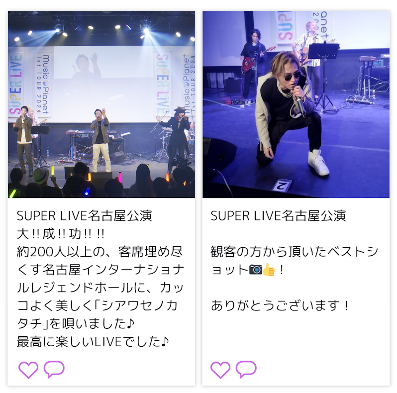 「本当に最高のライブでした!ライブが終わった今もまだ興奮が収まりません。何よりも、最高の仲間に出会わせてくれたミュージックプラネットに感謝です。」