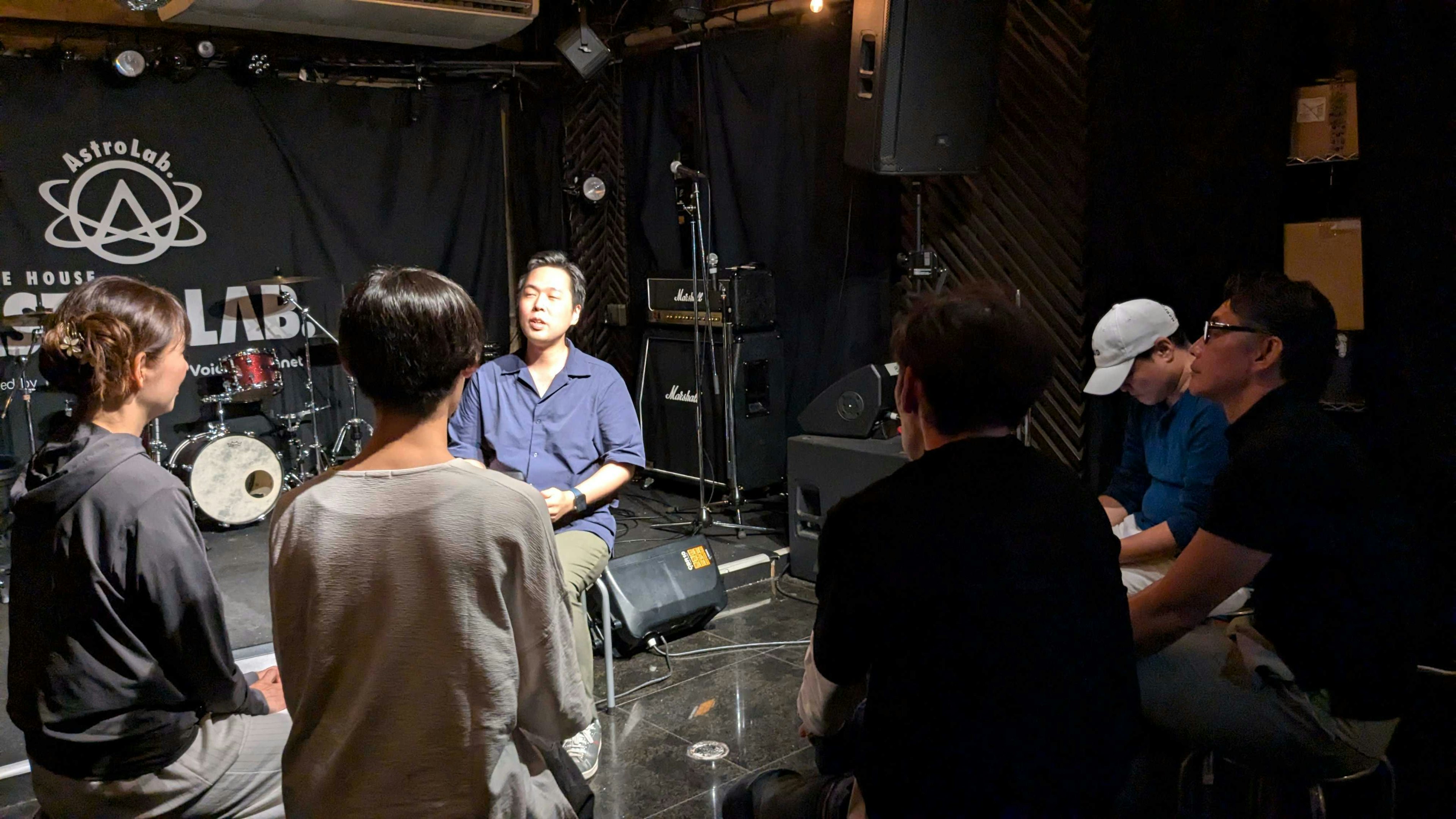 本番終了後にはJUN講師を中心にライブの感想やコメントを語り合う懇親会が実施されました。本日参加したアーティスト同士は初対面の方が多かったですが、同じ講師のボイストレーニングを受けているという共通点からすぐに意気投合。JUN講師の講義を受けて魅力を感じたポイントや他のボイストレーニングの講師にはない特徴などの話題で盛り上がりました。JUN講師に教わるアーティスト同士でもっと色々なことをやってみたいといった話題があがり、アーティスト同士の繋がりから今後の新たな展開を期待させるライブイベントになりました。