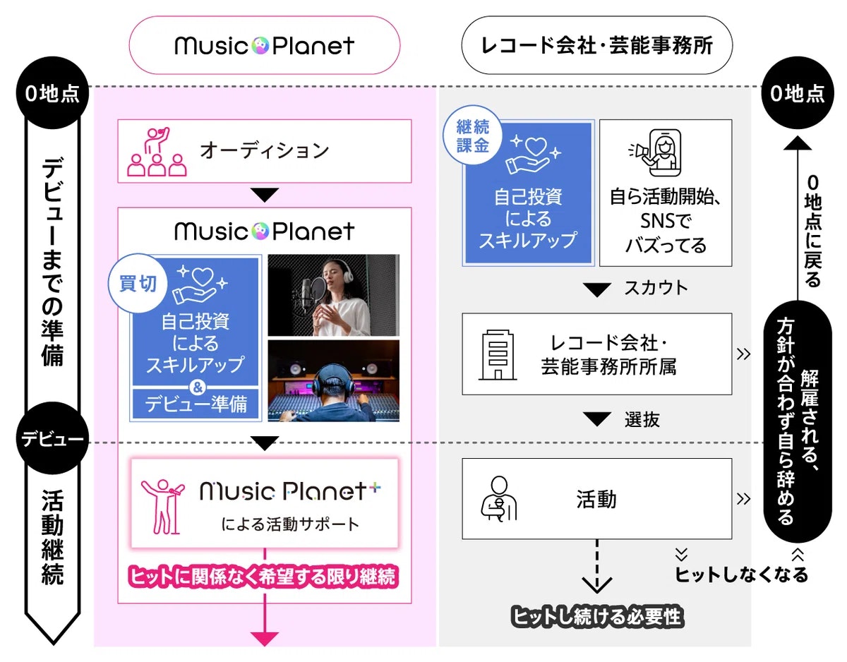 芸能事務所やレコード会社は、売れそうな人やすでにバズっている人に投資し、収益化する「投資回収型」モデルが一般的です。このモデルでは、すでに人気があるか、卓越した才能がないとチャンスが得られにくく、多くの人はまずスキルアップのためにレッスンなどの自己投資が必要になります。仮にデビューできたとしても、ヒットを出し続けなければ解雇の可能性も。また、投資した費用を回収しなければビジネスとして成り立ちません。そのため、アーティストの活動方針といった主導権はレコード会社や芸能事務所にあり、自分の思うように活動ができないこともあります。ミュージックプラネットは、そのような「投資回収型」モデルの事業ではありません。