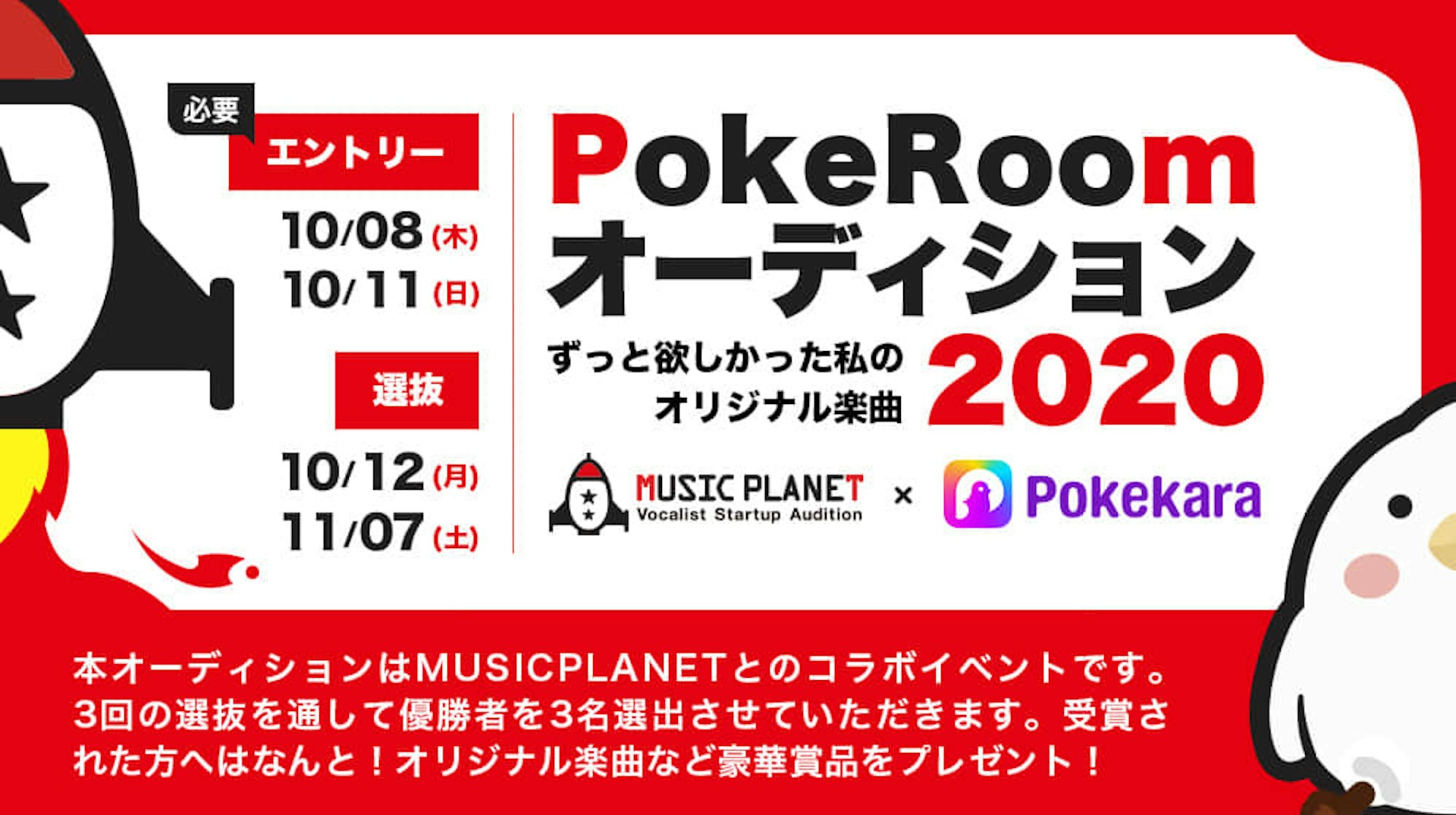 株式会社アプラ(東京都渋谷区、代表取締役:新妻 快介)が運営するボーカリストスタートアップオーディション、Music Planetは株式会社音娯時間エンターテインメント(東京都品川区、代表取締役:田中百合子)が運営する採点カラオケアプリ「Pokekara(ポケカラ)」と共同で「Pokeroomオーディション2020 ずっと欲しかった私のオリジナル楽曲2020」を2020年10月8日(木)より開催しています。